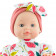Malé prekrásne bábätko má mäkučké telíčko, ruky, nohy a hlavu z vinylu. Na hlavičke nemá vlásky. Očká nie sú zatváracie. Je maličké a mäkučké, a s 27cm má skvelú veľkosť pre najmenšie detičky. Oblečené je v bielych šatočkách s potlačou čerešničiek, červených legínkach a čelenke.